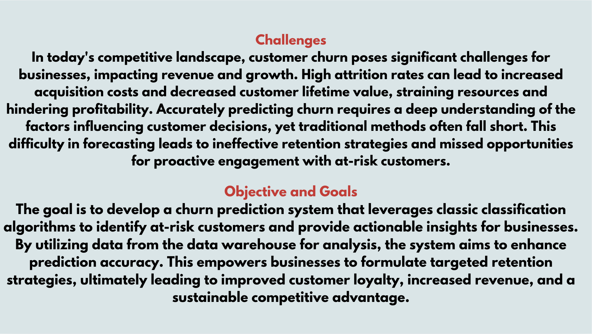 The project focuses on developing an intelligent classification tool that predicts customer churn in telecommunications, empowering businesses to enhance retention strategies and optimize customer satisfaction.