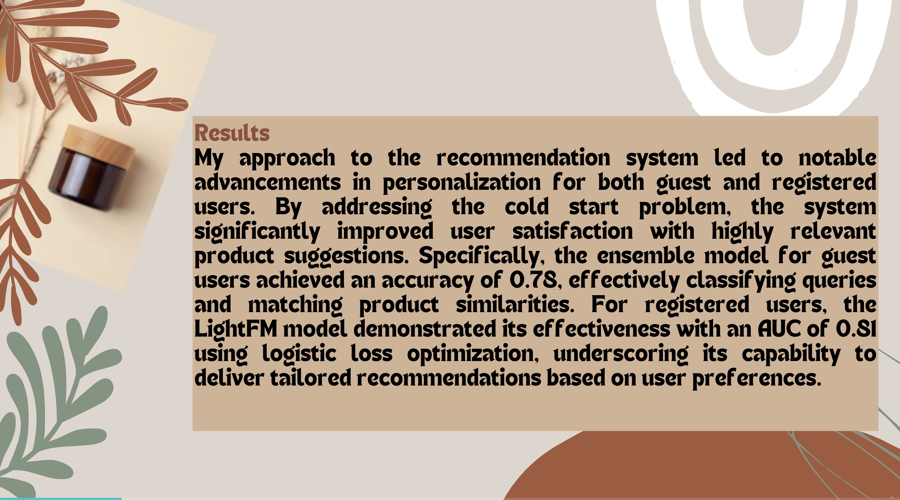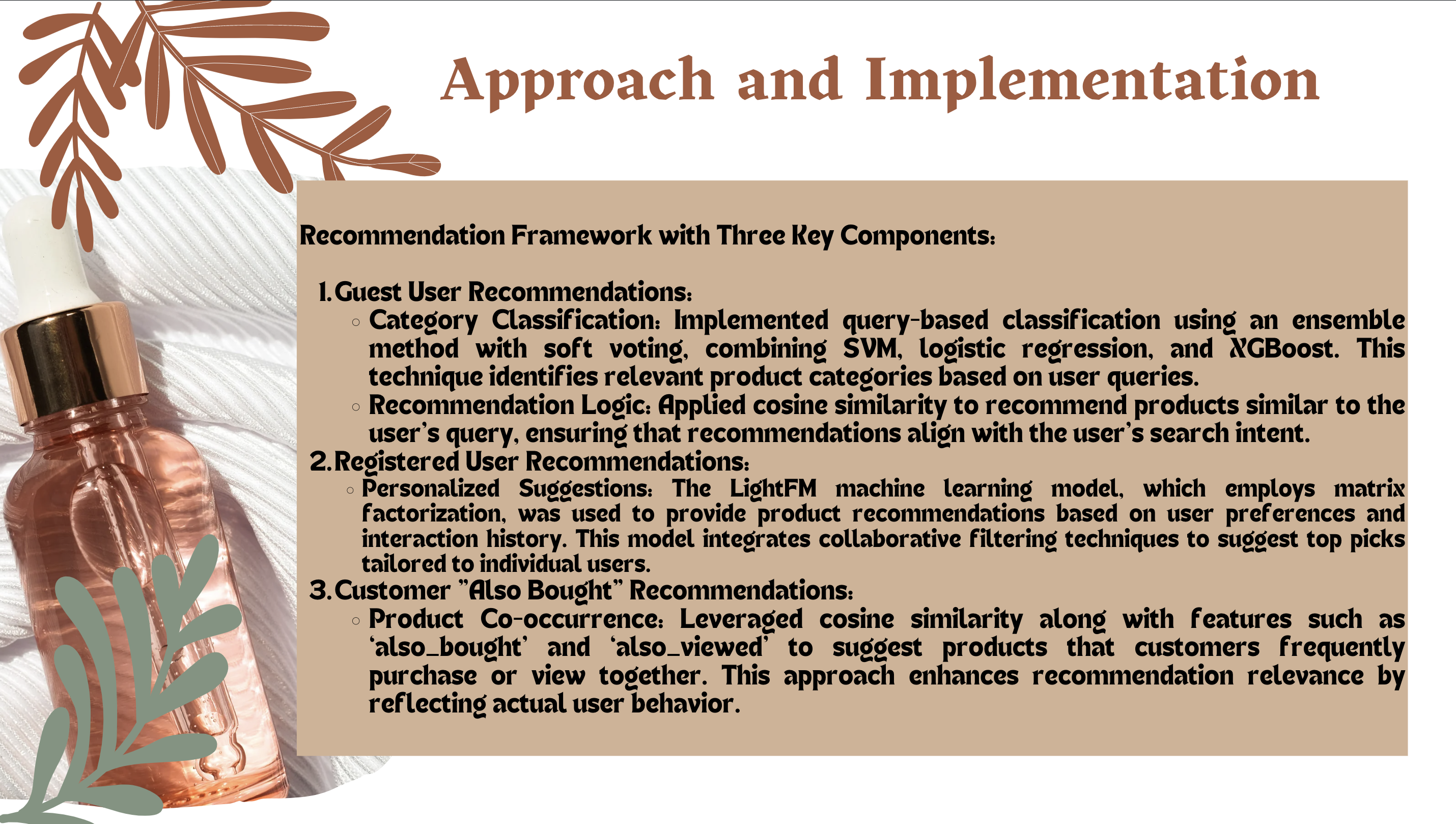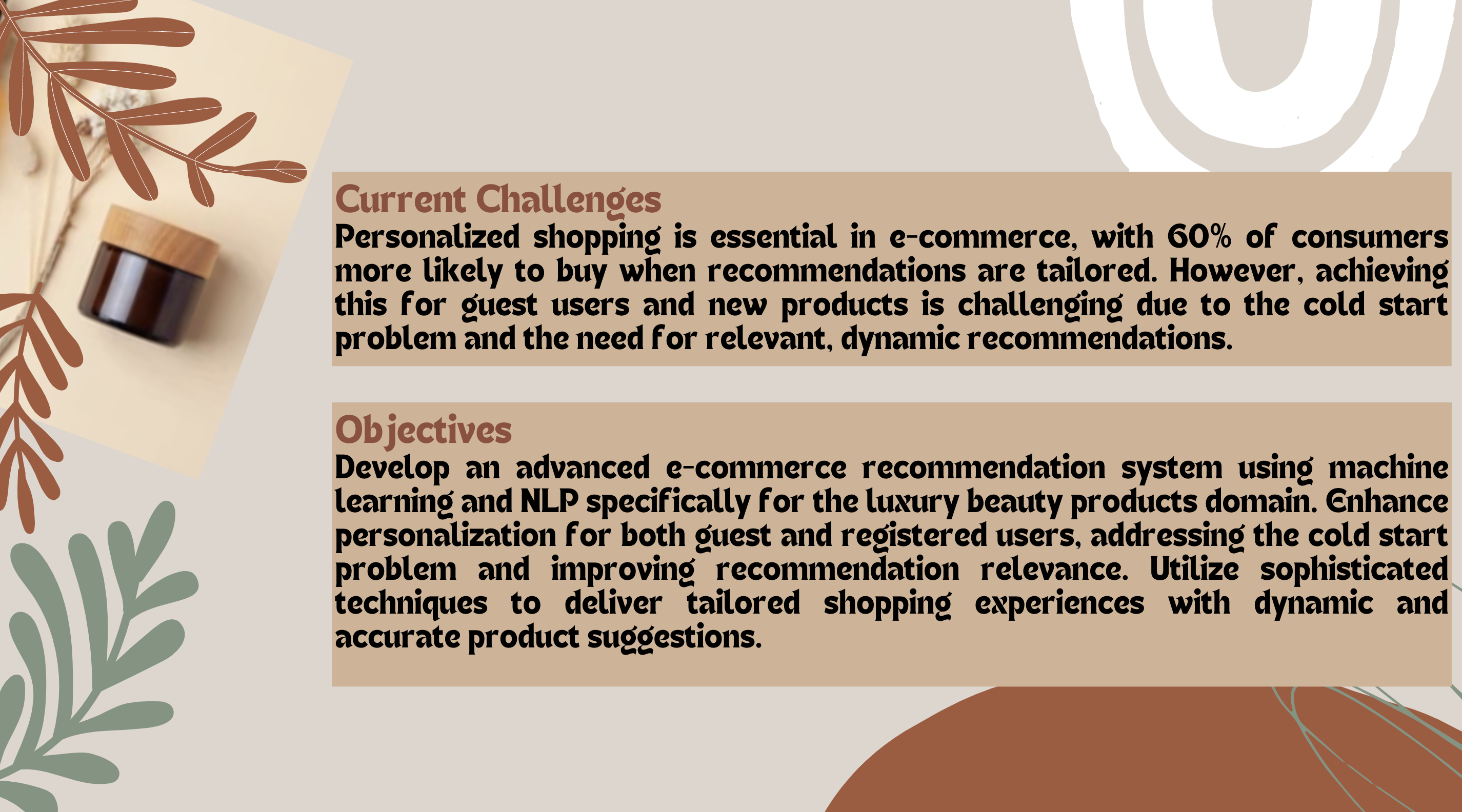 The project focuses on enhancing e-commerce personalization through advanced recommendation systems, leveraging machine learning and NLP to deliver tailored product suggestions for both guest and registered users.