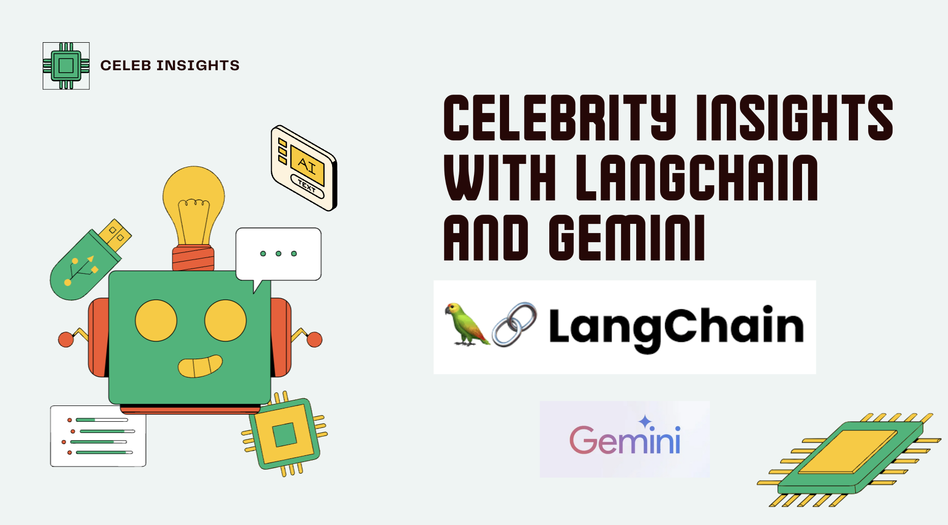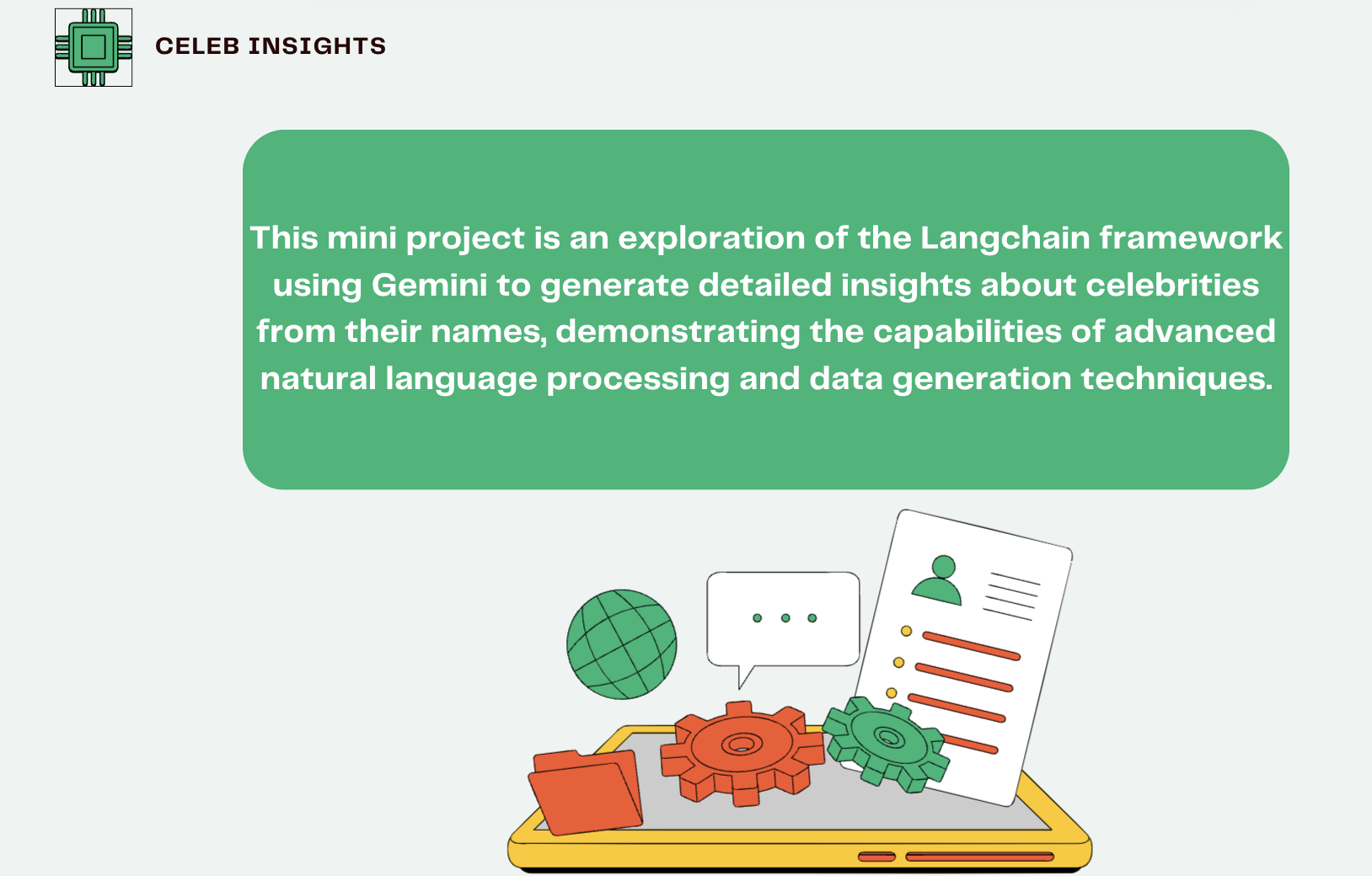 The project generates detailed insights about celebrities using Langchain and Gemini, fine-tuned with prompts and integrated into a Streamlit application for interactive querying.
